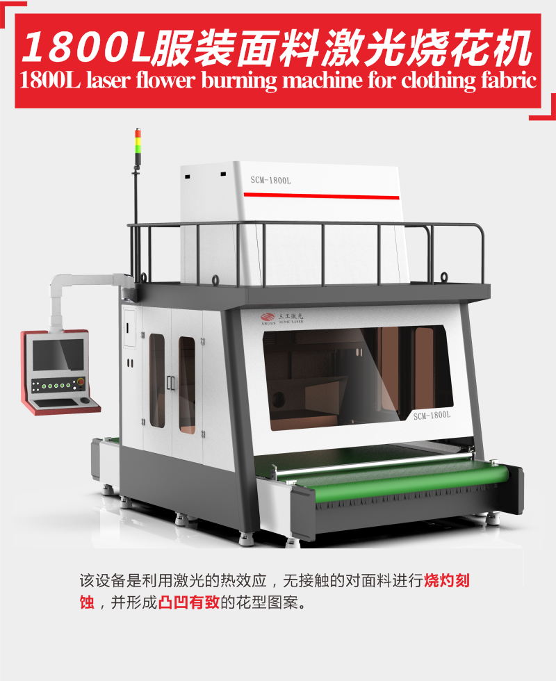 該設備是利用激光的熱效應,無接觸的對面料進行燒灼刻蝕,并形成凸凹有致的花型圖案。