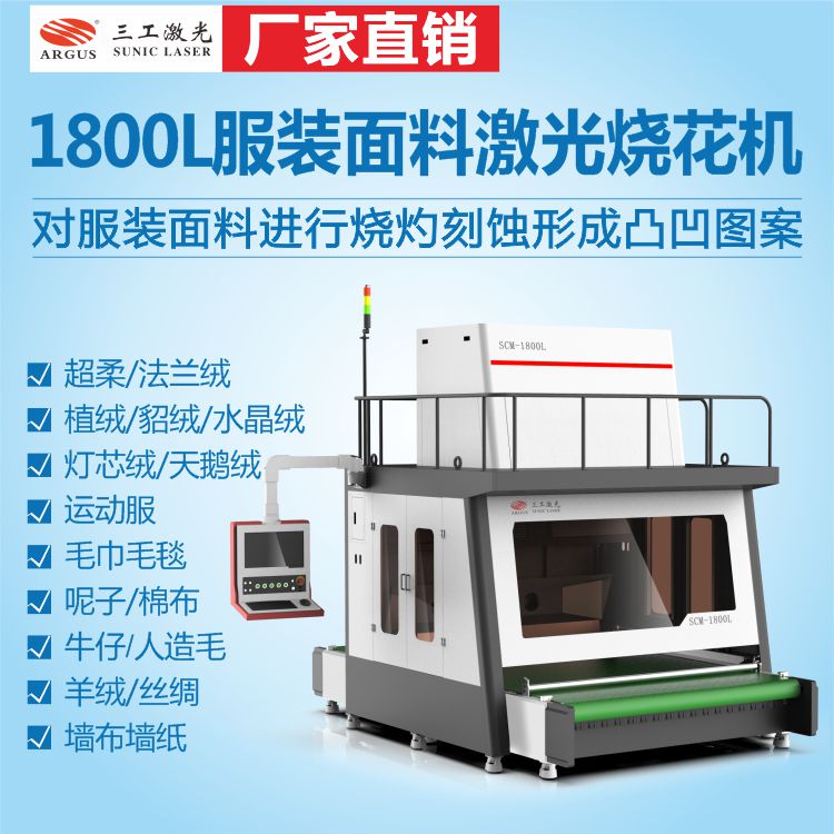 武漢三工服裝布料激光印花可以直接對服裝面料表面進行凹凸花紋。雕刻均勻,生產效率高,幅面雕刻速度可達10m/min,能夠滿足各種服裝設計對布料的需求。該機運行操作簡單,全自動化,不需要添加水或任何化學產品,也不需要進行排廢處理。