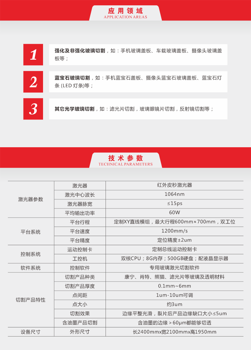 1、強化及非強化玻璃切割,如:手機玻璃蓋板、車載玻璃蓋板、攝像頭玻璃蓋板等;
